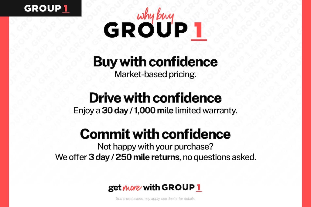 Buy with confidence at Group 1 where every used vehicle, up to 175,000 miles, comes with a one month 1,000-mile limited warranty along with a 3-day 250-mile return policy. Some exclusions may apply, see Buyers Guide for specifics. Every vehicle is priced to market and includes a Carfax History Report.