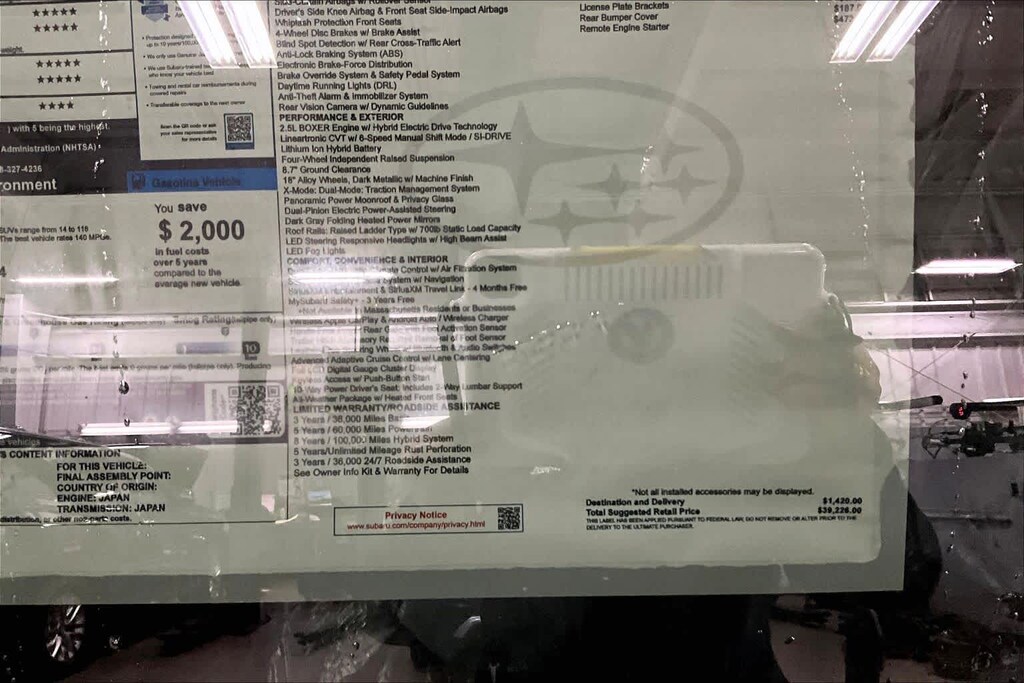 I bought this recently from Granite Subaru in Hudson, NH and I am so pleased I did. The Premium trim comes with great features AWD, Multiple cameras for safety, lane departure alert, 12" Media Screen with CarPlay, Panaramic Sunroof, roof racks, and much more. The size, features and gas mileage fit my life perfectly.
