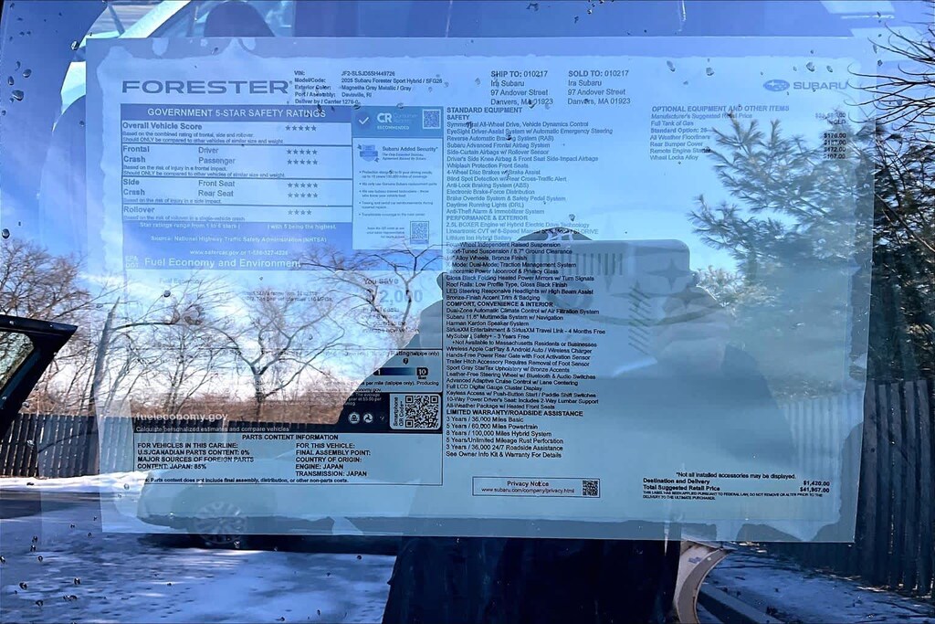 I bought this recently from Granite Subaru in Hudson, NH and I am so pleased I did. The Premium trim comes with great features AWD, Multiple cameras for safety, lane departure alert, 12" Media Screen with CarPlay, Panaramic Sunroof, roof racks, and much more. The size, features and gas mileage fit my life perfectly.