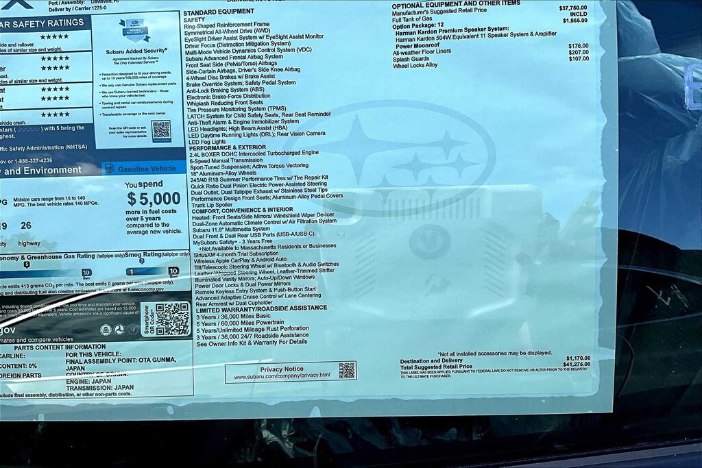 Among performance cars, on a scale from 1 to 10, today’s WRX holds its head up proudly at a solid 9. If you’re old enough to remember the age before pollution controls and safety features, you won’t argue with me when I cite the 1971 Ferrari 365 GTB/4 as a 10 (“Relaxed at 140, undemanding at 150…controllable at 193…but acceleration tends to fall off after 155,” according to the contemporary Road & Track article). Back to the WRX, I hadn’t passed the break-in period at the time I started writing (see below), and the manual advises short shifting at 4000 until that point. I’ve been observing 3,000, because the WRX is turbocharged and boost comes on strongly a little above 3,000 so that stopping the acceleration precisely at 4,000 is a challenge. So, I didn’t experience the full performance of the car at first. Nevertheless, its capabilities are obviously huge, triggering a flood of cliches from the sports cars of the 60’s-70’s. “Corners as if on rails…steering direct and linear up to speeds where I don’t want to find out if it understeers, oversteers, or just slides sideways at the limit…glued to the pavement.” There’s no body roll, no squeal from the tires, and acceleration even in top gear is pleasantly lively through 55, without ever exceeding 3,000 on the tachometer.