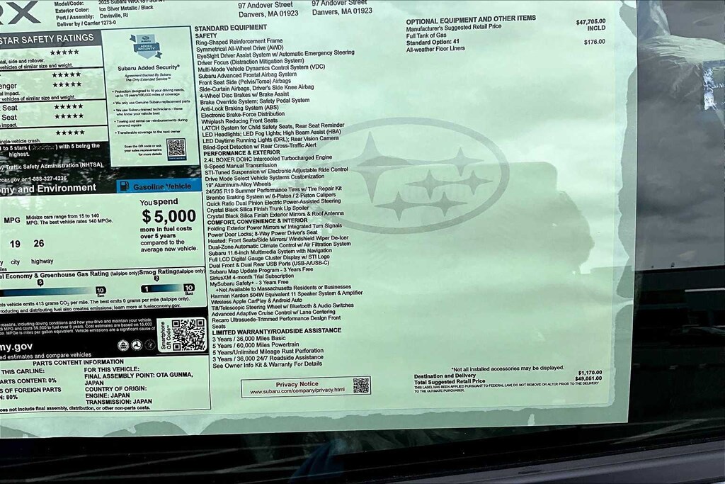 Among performance cars, on a scale from 1 to 10, today’s WRX holds its head up proudly at a solid 9. If you’re old enough to remember the age before pollution controls and safety features, you won’t argue with me when I cite the 1971 Ferrari 365 GTB/4 as a 10 (“Relaxed at 140, undemanding at 150…controllable at 193…but acceleration tends to fall off after 155,” according to the contemporary Road & Track article). Back to the WRX, I hadn’t passed the break-in period at the time I started writing (see below), and the manual advises short shifting at 4000 until that point. I’ve been observing 3,000, because the WRX is turbocharged and boost comes on strongly a little above 3,000 so that stopping the acceleration precisely at 4,000 is a challenge. So, I didn’t experience the full performance of the car at first. Nevertheless, its capabilities are obviously huge, triggering a flood of cliches from the sports cars of the 60’s-70’s. “Corners as if on rails…steering direct and linear up to speeds where I don’t want to find out if it understeers, oversteers, or just slides sideways at the limit…glued to the pavement.” There’s no body roll, no squeal from the tires, and acceleration even in top gear is pleasantly lively through 55, without ever exceeding 3,000 on the tachometer.