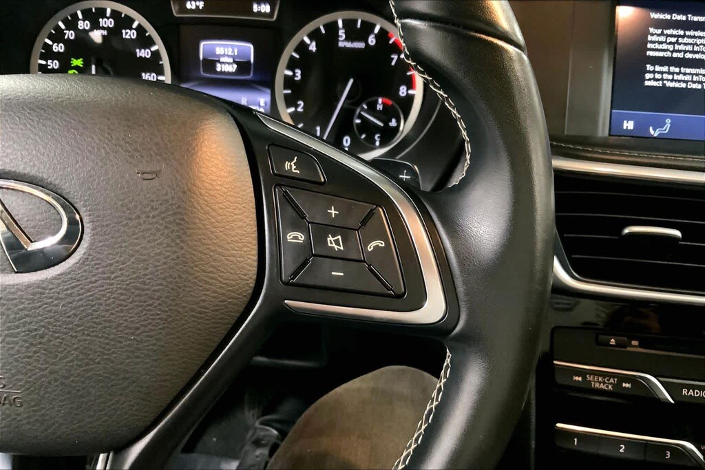 NAVIGATION PACKAGE SD card slot, Around View Monitor, Moving Object Detection (MOD), Color Center Meter Display, INFINITI InTouch Navigation System, 7 single screen, INFINITI InTouch services w/12 months of complimentary trial access to safety, security and convenience services and SiriusXM Traffic w/4-year complimentary trial access to real-time traffic information, (remote services unavailable), Front & Rear Parking Sensors, INFINITI RADIANT ILLUMINATED KICK PLATES: soft-glowing INFINITI logo along bottom of front doorsills, REAR BUMPER PROTECTOR, SPLASH GUARDS (SET OF 4), GRAPHITE, LEATHERETTE & TEXTILE SEAT TRIM, BLACK OBSIDIAN.
